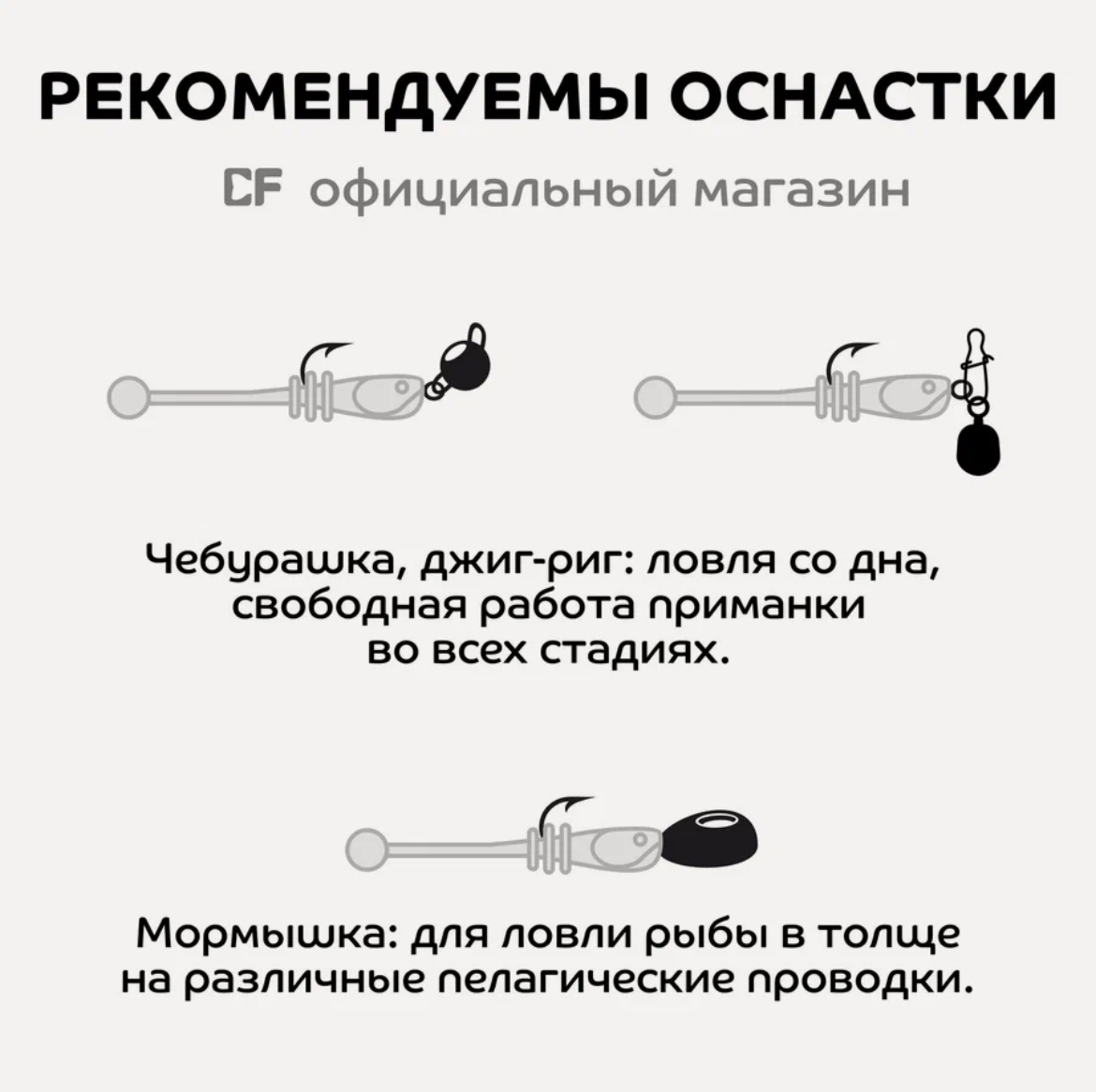 * **Что это:** Груз-"чебурашка" (два проволочных ушка) + крючок (чаще офсетный) + *соединительное звено* (застежка с вертлюжком или крошечная застежка).