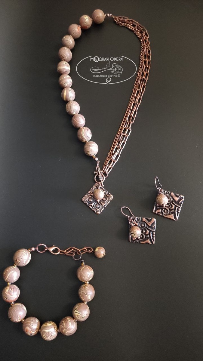 Новый комплект " В оттенках меди" Длина колье 50 см. Фурнитура медная. Бусины из полимерной глины, подвеска создана гальваническим способом.