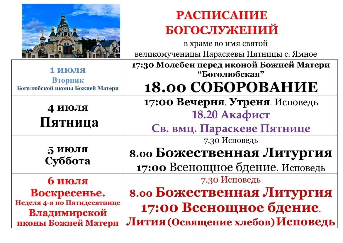 📅 РАСПИСАНИЕ БОГОСЛУЖЕНИЙ в храме святой великомученицы Параскевы Пятницы, с. Ямное 1 июля (вторник) 🔹 Память Боголюбской иконы Божией Матери 17:30 — Молебен перед иконой Божией Матери «Боголюбская» 18:00 — СОБОРОВАНИЕ 4 июля (пятница) 17:00 — Вечерня, Утреня, Исповедь 18:20 — Акафист св. вмц. Параскеве Пятнице 5 июля (суббота) 7:30 — Исповедь 8:00 — Божественная Литургия 17:00 — Всенощное бдение, Исповедь 6 июля (воскресенье) 📌 Неделя 4-я по Пятидесятнице 🔹 Память Владимирской иконы Божией Матери 7:30 — Исповедь 8:00 — Божественная Литургия 17:00 — Всенощное бдение. Лития (освящение хлебов), Исповедь 7 июля (понедельник) 🔹 Рождество Иоанна Предтечи 7:30 — Исповедь 8:00 — Божественная Литургия 8 июля (вторник) 🔹 Благоверные князья Пётр и Феврония Муромские 10:00 — Водосвятный молебен с акафистом святым Петру и Февронии 9 июля (среда) 🔹 Тихвинской иконы Божией Матери 7:30 — Полиелейная утреня, Исповедь 8:00 — Божественная Литургия 11 июля (пятница) 🔹 Иконы Божией Матери
