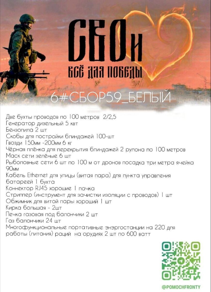 ⚡️😶😶😶😶 для Белого Арт. дивизион. - ландшафтные дизайнеры. Парни прикрывают наших, не дают врагу поднять голову и дизайн местности врага. И, конечно, и достается от врага. Отбивают орудие от Яги, и фпивишек. Недавно у них сожгли рабочий инструмент. Нужно окопаться заново и оборудовать точку. Очень рассчитывают на помощь СВОих. 2. Газ 28шт*75р=2100 4. Кабель 100м Провод ПВС 2х2,5 ГОСТ, 100 метров https://ozon.ru/t/wiM877C 5. Портативная электростанция 2шт *23645=47 290 https://ozon.ru/t/bpwdba3 6. Генератор 5квт - 53 661 https://www.ozon.ru/product/kezga-diesel-generator-dizelnyy-generator-5-kvt-5-5-pikovaya-s-elektrozapuskom-1335062061/ 8. Витая пара - 4618 https://www.ozon.ru/product/vitaya-para-kabel-bion-cat-5e-4-pary-305m-pe-chernyy-dlya-vneshney-prokladki-bcl-u5451-301-1959753786/ 11. Бензопила 1 шт - есть ( Волшебница) 12. гвозди - 85 руб х10Кг = 850 13. плёнка 2шт *2800= 5600 14. Сеть рыболовная 10шт * 1150= 11500 ❗️Сумма сбора: 139 906 Помочь СВОим ФРОНТ ✅ Т