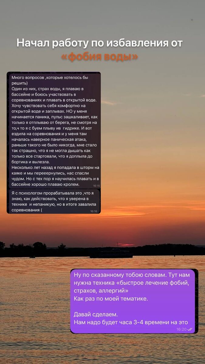 Начал работу по избавлению от «фобия воды». Запрос и описание проблемы от девушки «Много вопросов, которые хотелось бы решить :) Один из них — страх воды. Я плаваю в бассейне и боюсь участвовать в соревнованиях и плавать в открытой воде. Хочу чувствовать себя комфортно на открытой воде и заплывах. Но у меня начинается паника, пульс зашкаливает, как только я отплываю от берега, несмотря на то, что я с буем, плыву и в гидрике. И вот ездила на соревнования, и у меня там началась, наверное, паническая атака — раньше такого не было никогда. Мне стало так страшно, что я не могла дышать, как только все стартовали, что я доплыла до бортика и вылезла. Несколько лет назад я попадала в шторм на каяке, и мы перевернулись. Нас спасли чудом. Но с тех пор я научилась плавать и в бассейне хорошо плаваю кролем.» Что было сделано? Мы провели 1 отработку по избавлению от фобии, но в процессе предварительной беседы выяснилось, что есть много других причин, которые мешают жить полноценной жизнью и достига