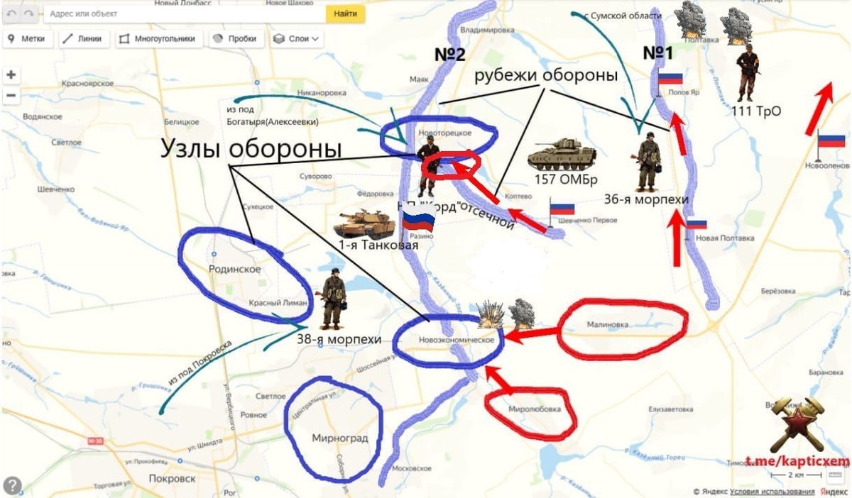 Восточный охват Покровска. Начало оперативного прорыва (продолжение) Схема середины июня, постепенно устаревает. На значки вражеских подразделений не смотрите, все уже поменялось. Важен общий посыл. ВС РФ блокировали два узла обороны - Новоторецкое и Новоэкономическое. создав угрозу, а проломили оборону рубежа №2 между ними, штурмом взяв Разино схемы и карты
