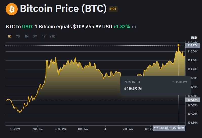 🪙 Стоимость биткоина во время торгов поднялась выше 110 000 долларов впервые с 11 июня 2025 года