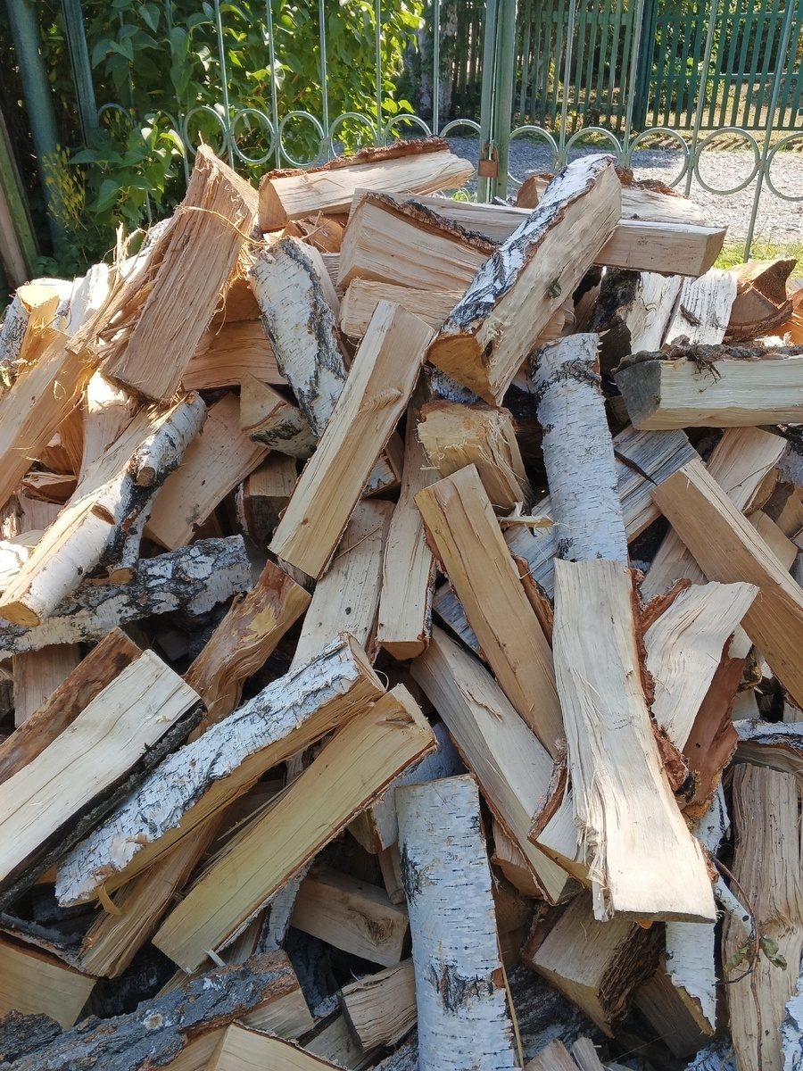 Вместо тысячи слов: Два вожделенных куба, которые не надо таскать в сумке зимой))) С утра купила, муж носил к поленнице, я раскладывала. Потом пришло время мне ехать к пенсионерам, а сын примчался и тоже принялся за дрова) Полную поленницу набили и в доме рядом с печкой тоже теперь запасик: В основном берёза, хотя попадалось и немного осины. Берёза сухая, в том году сплошной вымочкой торговали за бешеные тыщи (поэтому мы в том и не купили и дошли до жизни такой и до распила ёлок на мусорках))) Вернулась от деда к финалу процесса, но ещё немного дровишек в руках подержала. Потом собрали малину и сын поехал с малиной домой. А я решила ударно продолжить день и сжечь ещё весенний мусор во второй бочке. Там содержимое подсохло лучше, чем в первой, которая больше дымила, чем горела. Но всё равно дыма я произвела немало. И не успела закончить процесс, как пошёл дождь: После дождя продолжила. К отъезду на вторую бабушку успела с бочкой разобраться. И на дачу обратно не поехала - устала. Отправ