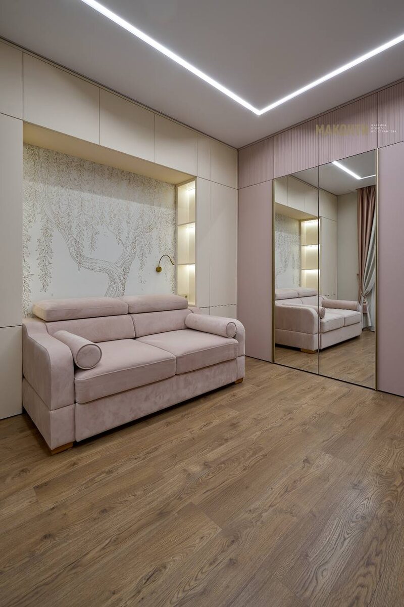 Угловой шкаф с нишей для дивана #маконти_проекты Особенности ▫️Фасады: пленка матовая + фрезеровка "волна" ▫️Цвет корпуса подбирался под цвет фасадов ▫️По зеркалам ручки на высоту фасада — смотрится легко, как обрамление зеркал 🕊️ ▫️Фурнитура: Blum ▫️Открытые ниши возле дивана с подсветкой. Вывели существующие розетки на корпус. Шикарно рассчитана мебель - розетки встали в эти ниши отлично! Наполнение ◽️Ящики полного выдвижения с доводчиком DTC ◽️Корзины для белья под ящиками — эффективное и эстетичное использование пространства✨ Как вам проект? Делитесь своим мнением в комментариях! ⚪️ Получить проект и расчет ⚪️ Записаться в шоу-рум ⚪️ Оформить выезд дизайнера