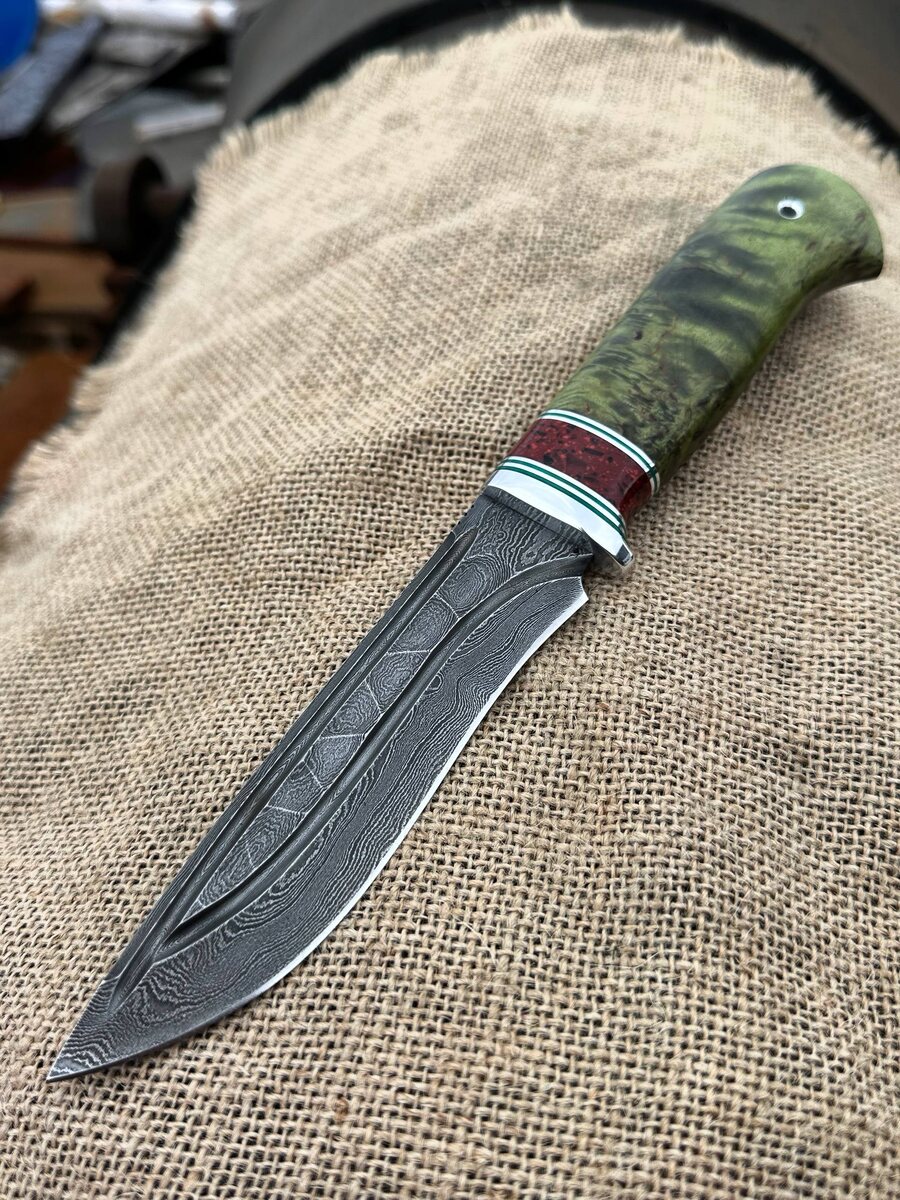 В свободной продаже вот такой симпатяга - разделочный нож Варан из дамасской стали (твёрдость 62 HRC) с фигурными долами и обработкой спусков под камень с рукоятью из стабилизированной зелёной карельской берёзы и акрила. Цена ножа 13776 руб, со скидкой: 11.700 рублей. Можем изготовить формованные ножны из кожи растительного дубления (+ 8000 руб.) Для заказа писать на @Nazarklinokbot или по тел +79101343831, WhatsApp, Viber.