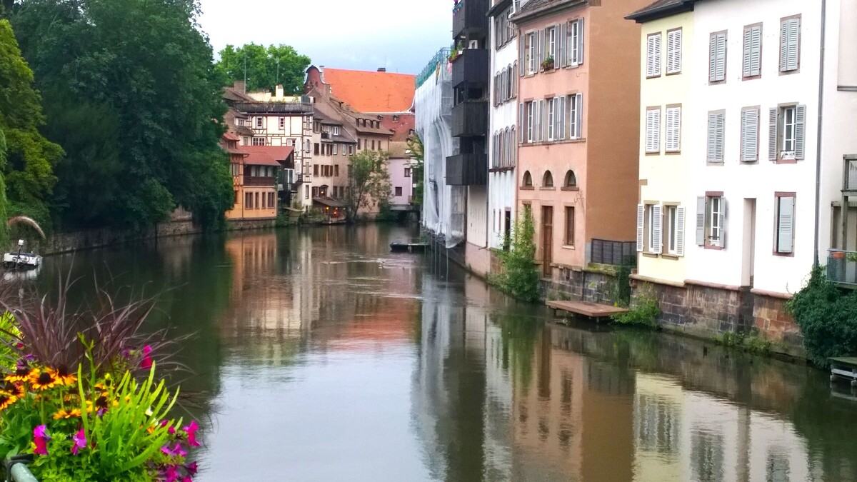 Во-первых, чтобы успеть к началу лазерного шоу на стенах Страсбургского моста, а во-вторых — хотелось поймать на камеру последние лучи заходящего солнца. Оно, из последних сил цепляясь за крыши домов и соборов, оставляло оранжевый след на висящих над каналами цветочных горшках и на полосатых, местами изъеденных жуками, фахверках.