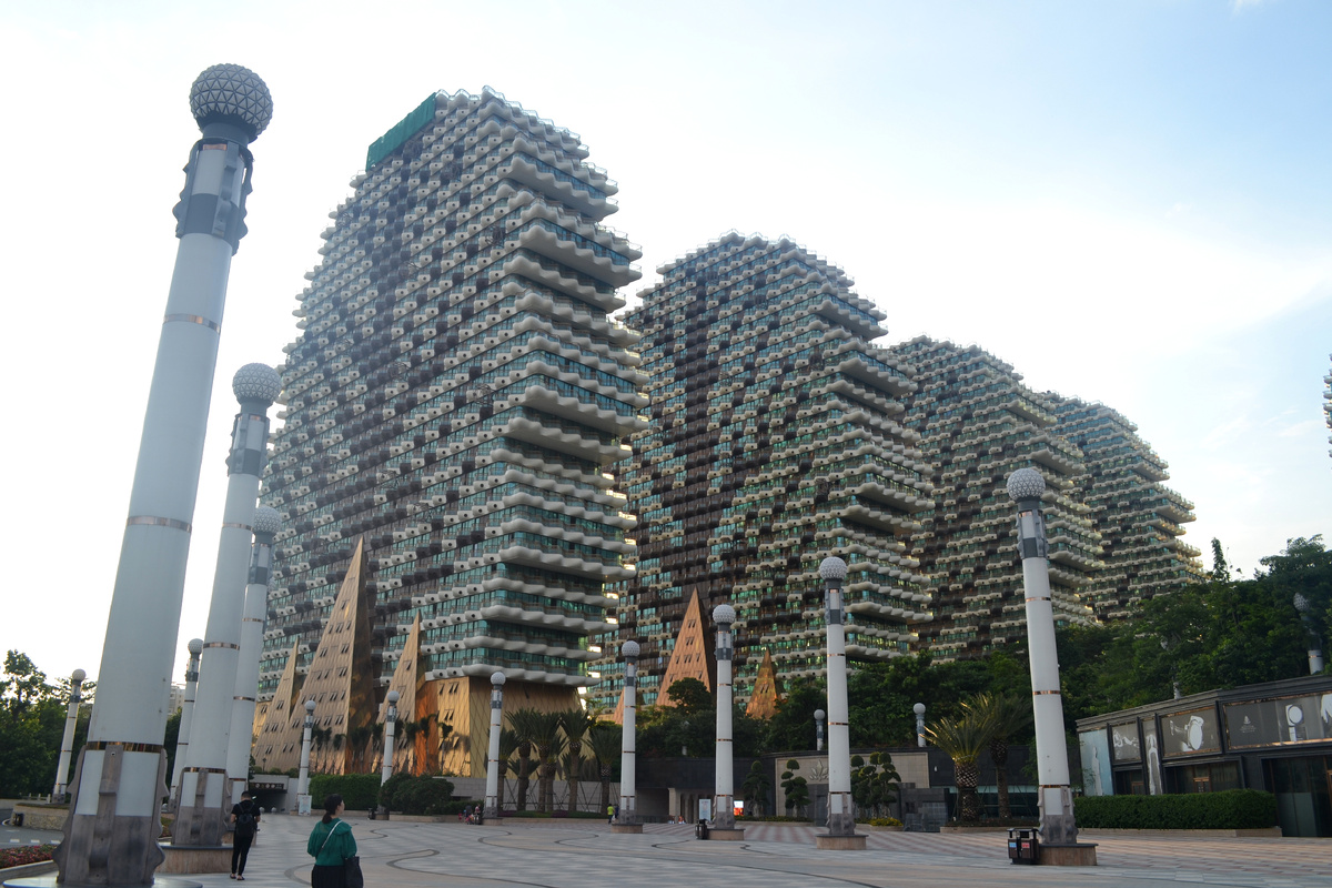 Сегодня поедем посмотреть на очень красивый и необычный комплекс-отель Beauty Crown в Санье!Комплекс построен на берегу реки из девяти небоскрёбов.В них находятся отели 5 и 7 звёзд,но ...вокруг такая пустота. Доехали мы туда на автобусе,в котором познакомились с ребятам из Читы.-Алиной и Димой.Решили вместе пойти погулять. Людей тут вообще нет,по крайней мере мы встретили только охранников.Хотели мы было подняться на балкончики и посмотреть на город сверху,но охрана сказала нам,что сейчас на балконы никого не пускают.В одном из холлов такого дома-дерева было очень красиво,как будто в Эрмитаж попали! Поднялись мы на лифте и неожиданно вышли в другом здании.Двери на балконы были и правда закрыты,поэтому сфоткали только так. Над этим проектом трудились известные архитекторы,которые строили небоскрёбы в Дубае.Высота этих домов около 100 метров.Выполнены они в форме деревьев да и на балкончиках растёт зелень!Строительство обошлось в миллиард долларов.Здесь есть и рестораны и бутики,те