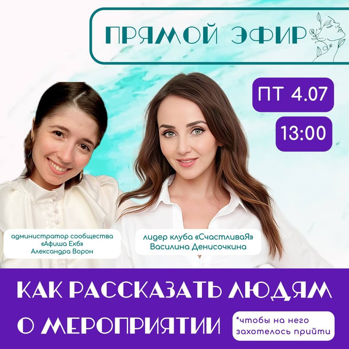 💡Как рассказать о своём мероприятии, чтобы на него захотелось прийти? Ты создаёшь встречи, вкладываешь сердце, покупаешь рекламу… А в ответ — тишина. Знакомо? 🎙️🎙️🎙️🎙️🎙️ Приглашаем тебя на ПОЛЕЗНЫЙ ЭФИР, где ты УЗНАЕШЬ, КАК ДОНОСИТЬ ЦЕННОСТЬ своих событий так, чтобы на них действительно ХОТЕЛОСЬ ПРИЙТИ. В эфире: 💜 Василина Денисочкина — лидер клуба «СчастливаЯ», пространства женщин, созвучных сердцем 💜Александра Ворон — администратор сообщества «Афиша Екб», с опытом работы в ивент продюсировании ✉️Обсудим: • Что делает вашу рекламу привлекательной, а что отталкивает; • Как использовать интернет площадки «с умом»; • Разберем несколько объявлений;
