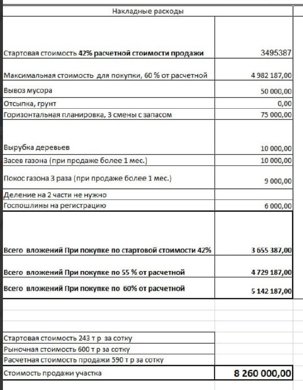 Насколько точно мы делаем ценовой анализ перед покупкой участков? На скрине один из лотов этой недели. 📍 Расчетная стоимость продажи участка: 8 260 000 ₽ 🧮 Мы определили желаемую цену покупки - 3 495 387 ₽ (42% от цены продажи) 💡 Верхний предел цены покупки — 4 982 187 ₽ (60%), выше — неинтересно 📉 Фактическая цена, по которой был продан лот: 7 165 557 ₽ что на 13% меньше нашей оценочной цены продажи. ➡️ Это ниже нашей оценки продажи на 13%, но выше комфортной цены покупки на 30% . ➡️ Разница между нашей оценкой и итогом торгов — всего 1,1 млн ₽ Что это говорит о нас? — Мы очень точно считаем «рынок» — Учитываем все расходы вплоть до покоса газона — Видим границу рентабельности и не переоцениваем потенциал 📌 Такие оценки — основа нашей стратегии. Минимум рисков, максимум контроля. Если вы хотите зарабатывать на земельных участках нашими усилиями вложив только деньги, то заходите в инвест канал https://t.me/zeminv_bot
