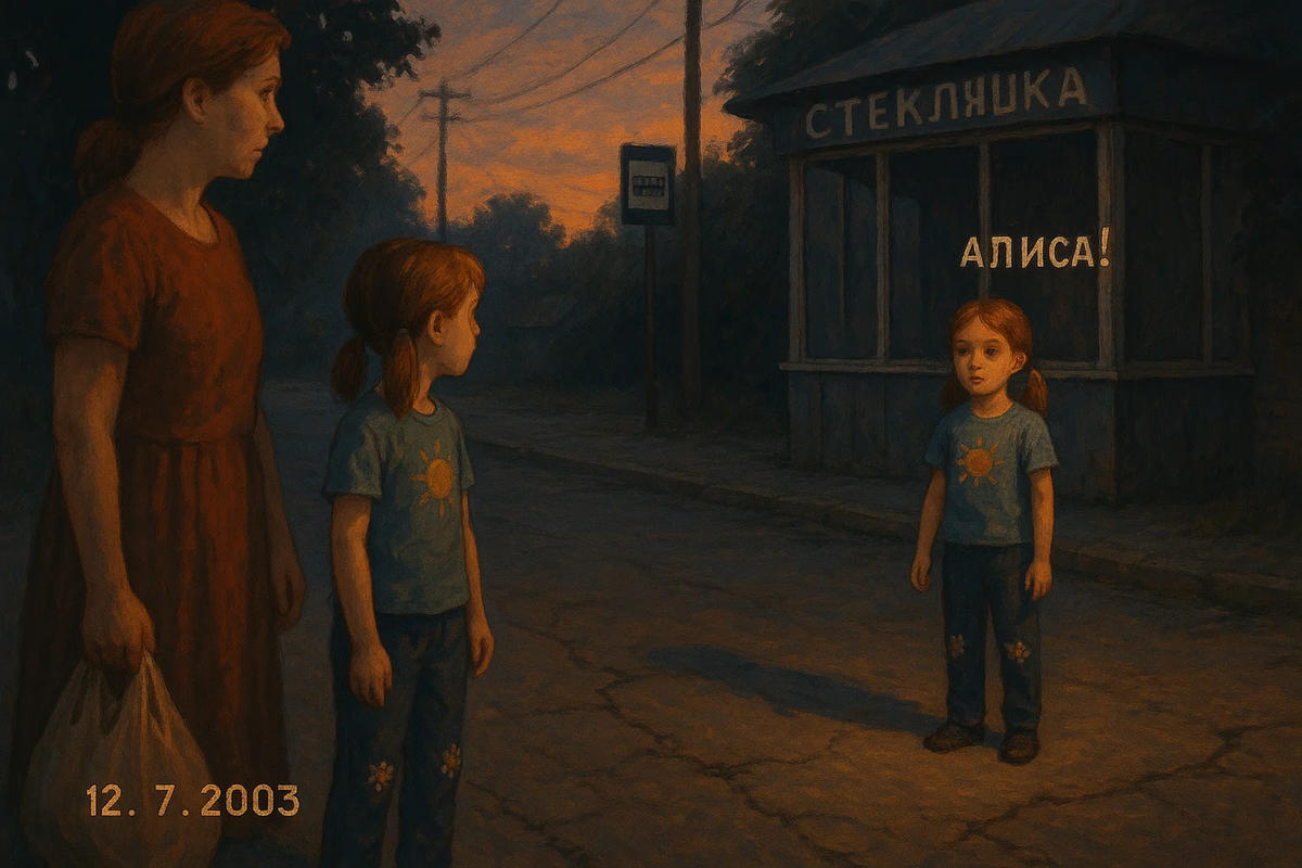 Вечер 12 июля 2003 года был тёплым и безветренным. Мне, Алисе, было восемь лет, и я возвращалась домой с мамой, Светланой, из продуктового магазина на углу нашей улицы в небольшом городке под Новосибирском. Мы шли по привычному маршруту, вдоль старого ларька у автобусной остановки, который местные называли "стекляшкой" из-за его облупившихся стеклянных витрин. В руках у мамы покачивались тяжёлые сумки с покупками, а я, как обычно, плелась чуть позади, разглядывая трещины в асфальте. Вдруг я услышала, как кто-то громко выкрикнул моё имя: "Алиса!" Голос был звонкий, почти пронзительный, но в то же время странно знакомый, словно эхо моего собственного. Я замерла и обернулась. На другой стороне улицы, примерно в семи метрах от меня, стояла девочка. Она была точной моей копией: та же голубая футболка с выцветшим рисунком солнца, те же тёмно-синие штаны с вышитыми ромашками на коленях — узором, который мама сделала специально для меня. Даже её волосы, собранные в два хвостика, были такими ж