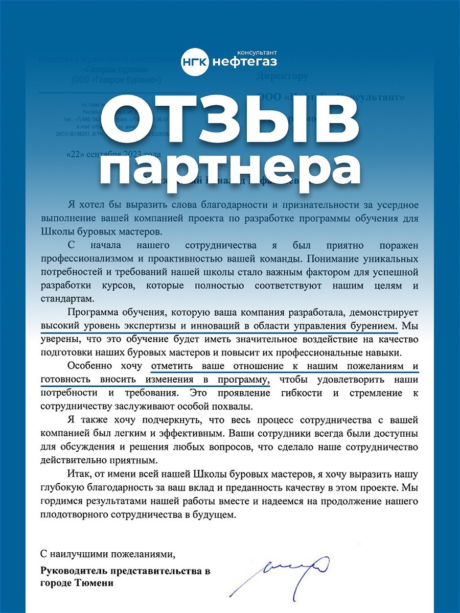 🗣 Заказчик пишет о нас: «Мы уверены, что это обучение будет иметь значительное воздействие на качество подготовки наших буровых мастеров и повысит их профессиональные навыки. Особенно хочу отметить ваше отношение к нашим пожеланиям и готовность вносить изменения в программу, чтобы удовлетворить наши потребности и требования. Это проявление гибкости и стремление к сотрудничеству заслуживают особой похвалы». * Полный текст письма от руководителя ООО «Газпром бурение» на изображении. 🥇«Школа буровых мастеров» дала отличные результаты благодаря тому, что мы создали обучение под индивидуальный запрос клиента. Подробности интереснейшего проекта читайте по 👉 ссылке
