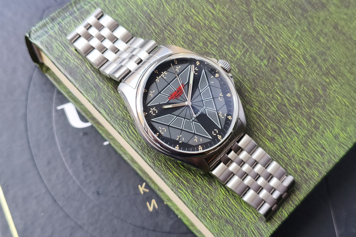 К выходу нового фильма Predator: Badlands (7 ноября) киновселенной Хищник мы подготовили двое часов в стилистике этого мира. К производству было подготовлено четверо часов, но двое были проданы на стадии релиза и так и не дошли до сайта и магазина. И вот, одни их двух часов поступили к нам и сегодня были размещены и на сайте, и в розничном магазине. У выпущенной модели есть три интересные особенности: Первая: уникальный циферблат, выполненный с 3D исполнением Superluminova от американского бренда Lum-tec. Бренд специализируется на девятислойном покрытие люминесцентного состава, что обеспечивает максимально выпуклый орнамент и сверхъяркое, и долгое свечению разметки. Разметка на циферблате выполнена шрифтом Яутжа (Predatoe), центральную часть циферблата украшает фирменный треугольный прицел Хищника. Обратите внимание на люм. Если фотография с циферблатом выполнена в студии на профессиональном оборудовании, фото в темноте сделано на китайский смартфон без обработки и фильтров. Вторая осо