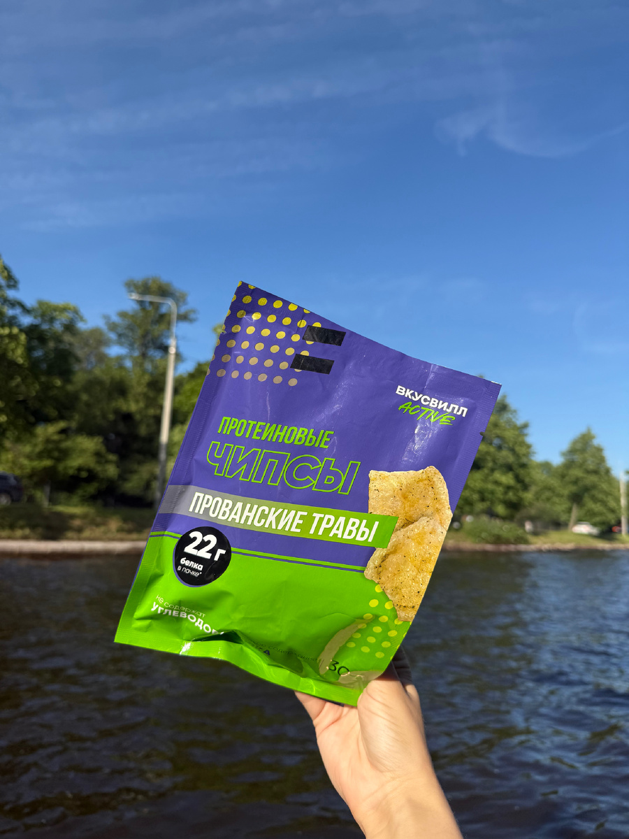 Если вы, как и я, обожаете хрустяшки, но стараетесь держаться правильного питания, то этот обзор для вас. В магазине «ВкусВилл» лежат протеиновые чипсы, и я наконец-то попробовала вкус “Прованские травы”. Делюсь мнением честно 👇 Состав и польза Основа - белок животного производства, подсолнечное масло и вкусно-ароматические вещества Без сахара, без глютена Ароматизатор - натуральные прованские травы (чеснок, базилик, розмарин, тимьян и другие) В 1 упаковке (35 г): • Белки - 22 г • Жиры - 4 г • Углеводы - отсутствуют • Калории -123 ккал По БЖУ очень круто для ПП-рациона! Вкус и текстура Хрустят громко, напоминают чем-то воздушные кукурузные снеки, но иногда чувствуется вкус яиц, очень на любителя. Вкус трав чувствуется, есть лёгкая солоноватость. Что понравилось • Отличный состав • Высокий белок - удобно добрать норму в день • Необычный вкус • Удобно брать с собой Что не зашло − Стоит дороже обычных снеках ( почти 200 рублей за 35 грамм) − Если ждать «вкус как Lays»
