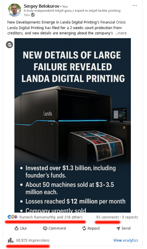 Думал, что просмотры по новости о компании Landa будут идти стремительно вниз на зарубежной аудитории в соц сети LinkedIn. Но я ошибался. Наоборот пошел рост по активности. Не хотел сильно хвастаться. Но если я себя не похвалю кто похвалит? Уже на самом деле за 2 не полный дня более 85 тыс просмотров публикации. И, наверное, человек 50 присоединились ко мне за эти два дня. В русскоязычной аудитории, на дела компании Ланда как всем с большой колокольни. Первым делом размещаю посты тут — https://t.me/sergeybelokurovinkjet