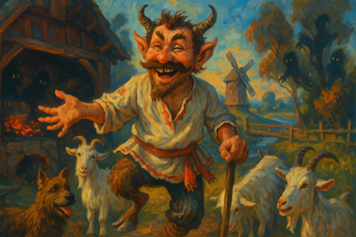 А знаете, что ещё примечательно? Чёрт обожал домашних животных! Мог жестоко наказать хозяев, которые плохо обращались со скотиной. Чем не греческий Пан? Недаром пастухи всегда носили дудочки да вешали коровам звонкие колокольчики — под музыку чёрт засыпал и не безобразничал!