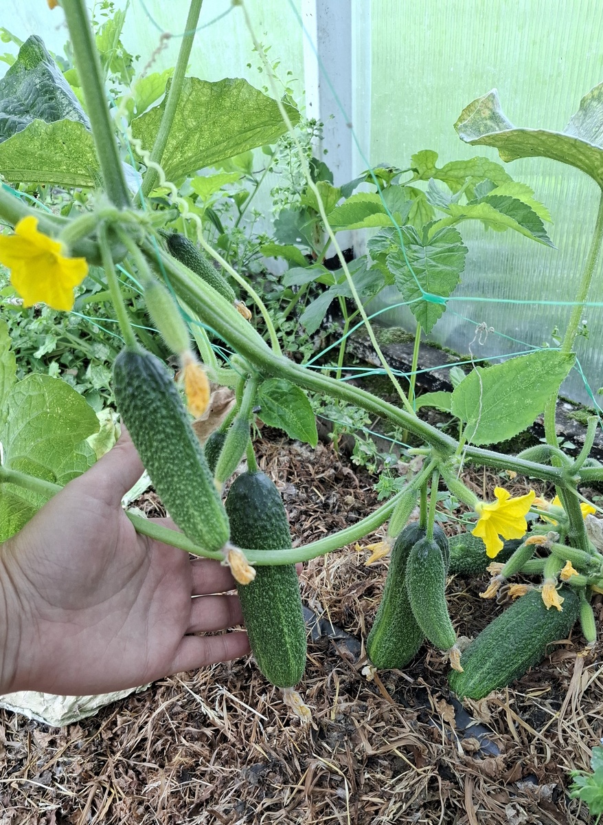 На выходных уже стали плодоносить все 5 кустов. Это всё те же мелкошипные. Тут справа видно пучок неразвивающихся завязей - не удалила их вовремя и толку от них нет, не стали расти. Удалила теперь. Это пошли наконец крупнобугорчатые, мне такие больше нравятся, эти шипы не так царапаются. Это я сняла в субботу, просто поесть на ужин. А это уже сбор в воскресенье, тут разложены по кустам. Где-то побольше плодов, где-то поменьше. Но всё равно самые вкусные и хрустящие!