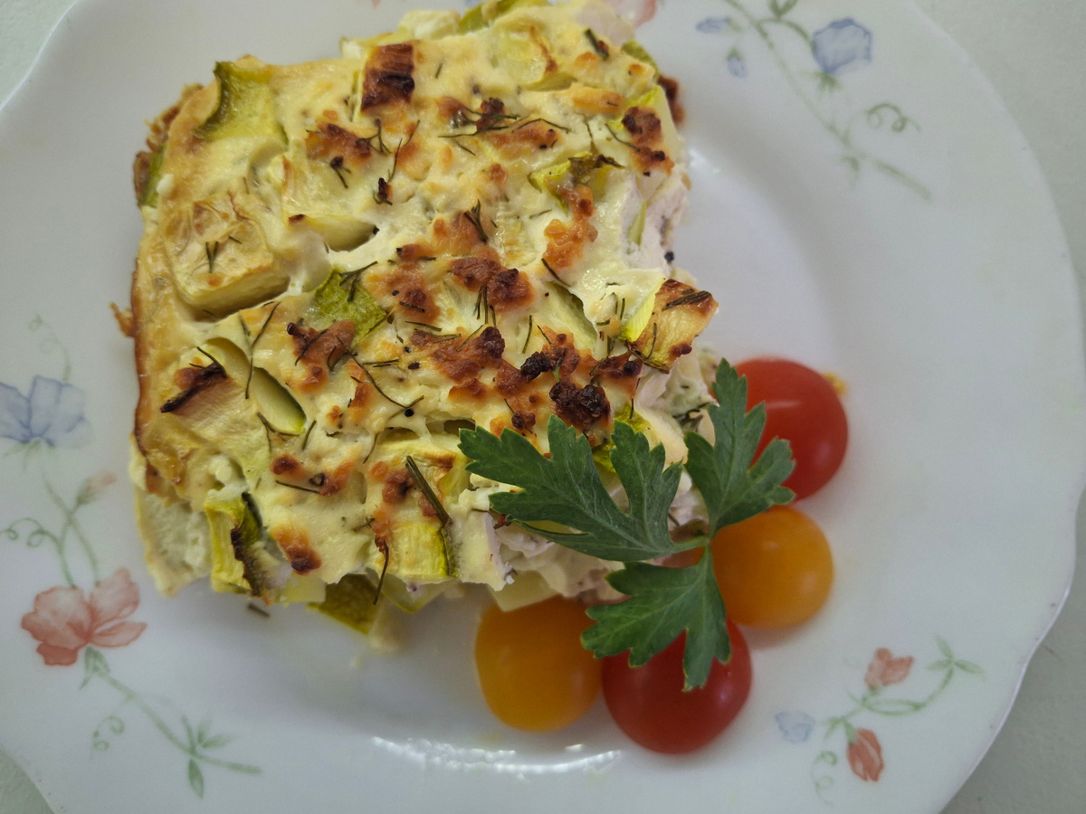 Состав: Приготовление: Кабачки режем мелким кубиком. Выкладываем в миску и сбрызгиваем (поливаем) маслом и перемешиваем. Не солим!! В другой миске смешиваем заливку: творог, йогурт, соль, перец, натёртый чеснок и порезанную зелень. (добавлять или нет яйца, решать вам!) Форму для запекания смазываем маслом и посыпаем панировочными сухарями. Излишки стряхиваем. В подготовленную форму выкладываем половину кабачков и вваливаем половину заливки. Затем выкладываем вторую часть кабачков, разравниваем и вливаем остатки заливки. Утрамбовываем ложкой или лопаткой. Ставим в разогретую до 180 градусов духовку на 40 минут. Достаём, даём немного остыть. Готово. Приятного аппетита!!!