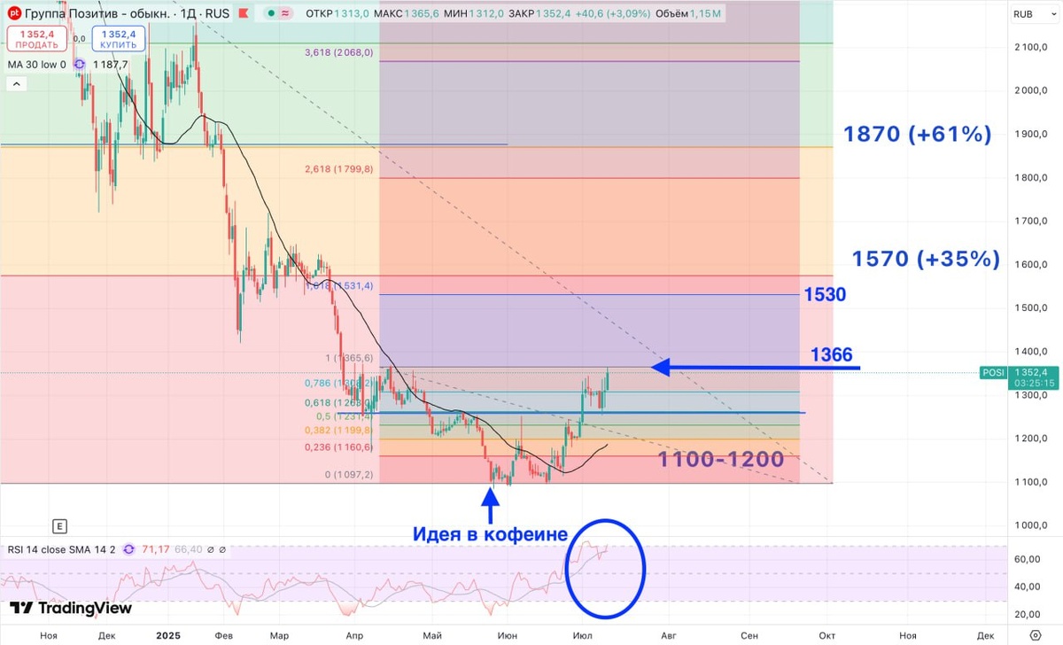 Позитив пришёл к важному уровню на 1366 рублей 👌