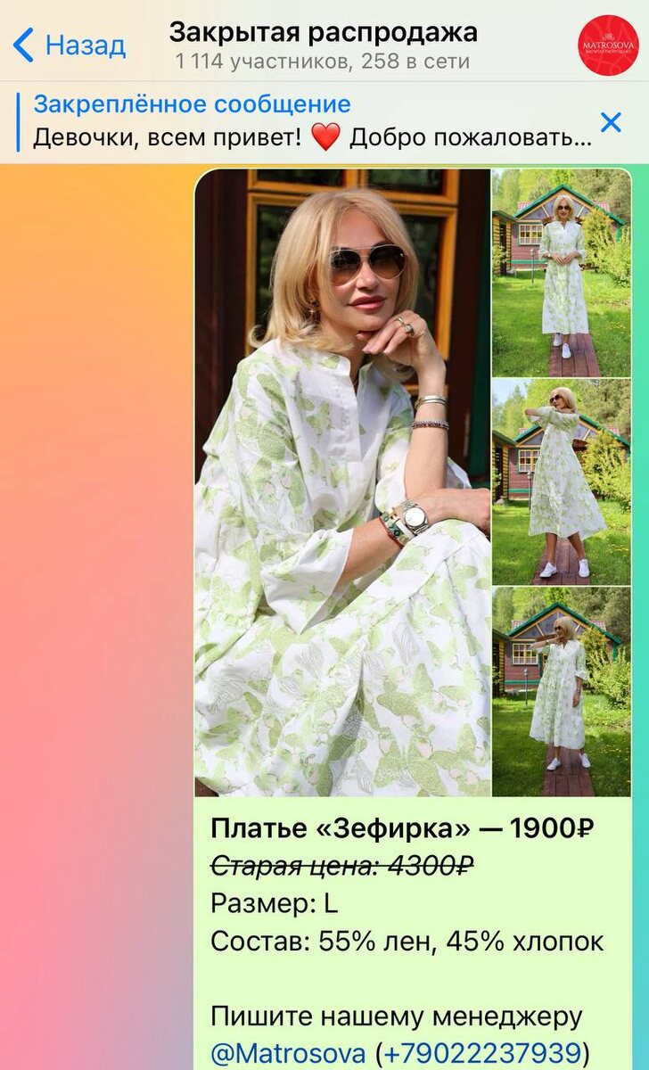 Девочки, у нас есть отличная новость! Переходите в наш распродажный чат, где вы сможете найти удивительные скидки на многие вещи! Например, наше великолепное платье «Зефирка» и юбки на запах теперь по очень выгодным ценам 🔥 Не упустите возможность обновить свой гардероб! Мы периодически выставляем новые вещи, и вы точно найдете что-то по своему вкусу. Ждем вас в нашем чате по ссылке: https://t.me/matrosovasale
