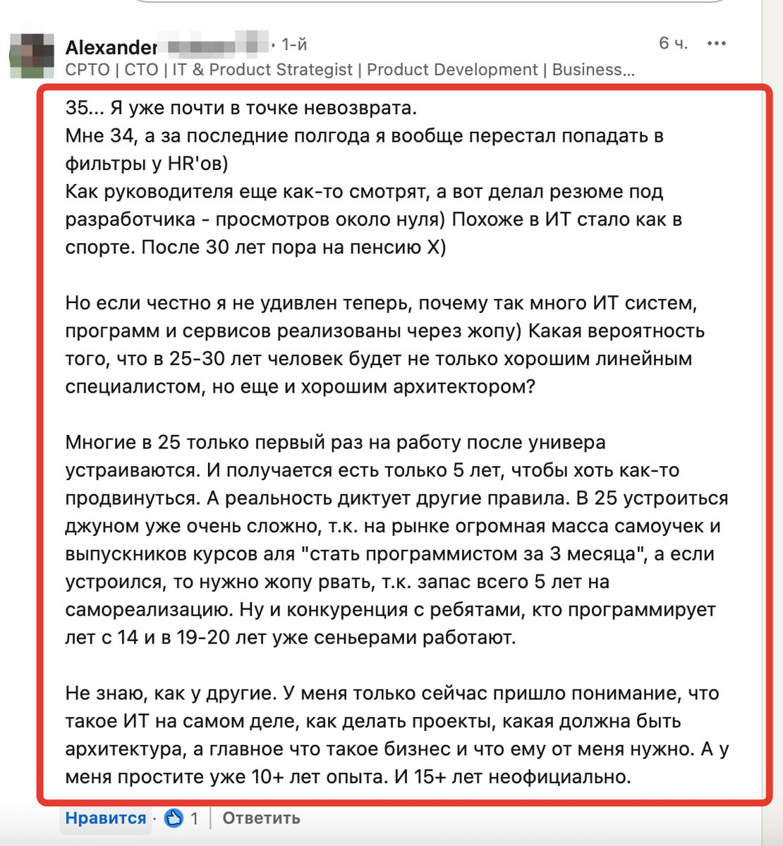 Не могу удержаться - по поводу эйджизма в ИТ в России. Ранее публиковал вакансию, где верхний предел по возрасту был четко указан - 35 лет... И вот, читаю очень разумный комментарий. Тут не добавить не убавить - все по делу. Замкнутый круг - работодатели предпочитают молодых, менее опытных, но с большим уровнем тестостерона :), которые еще учатся. Молодой вырастает, становится менее гибок, более требователен (опыт не пропьешь), работодатель нервничает и снова берет молодых :) которые косячат (и это нормально, опыта мало). А потом работодатель жалуется на дефицит кадров. Потому что нужные им компетенции вряд ли можно наработать в 25-35, а те у кого они уже есть слишком возрастные и требовательные. А нанимать 50+ религия не позволяет. Вот и мучаются :) Русский ИТ бизнес