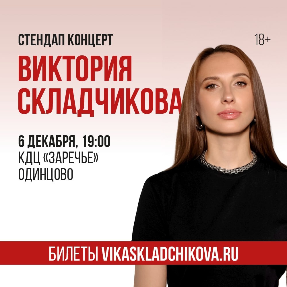 Виктория Складчикова - стендап-комик. Вика начинала юмористическую карьеру с искренних монологов о своей жизни. Неординарные истории она рассказывала без прикрас, смело приправляя их остроумными шутками и яркими отыгрышами. Складчикова не боялась быть комичной, ловко балансируя между двумя гранями: забавной непосредственностью и очаровательной утонченностью. Сегодня Вика делится со зрителями не просто смешными случаями, а своими переживаниями. Рассуждает о семье, карьере, замужестве и самодостаточности все с той же простодушной прямотой. В новом концерте Складчикова, как обычно, честно расскажет о том, что ее живо волнует и поделится с аудиторией своими мыслями в присущей ей ироничной манере. Продолжительность 1,5 часа без антракта https://vikaskladchikova.ru/#rec296528669