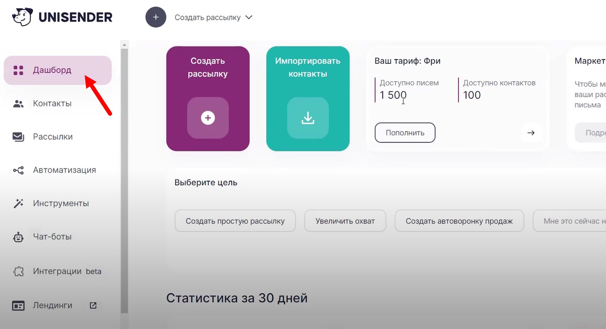 • Dashboard (Панель управления) включает общую информацию о тарифе, количестве доступных писем и контактах.