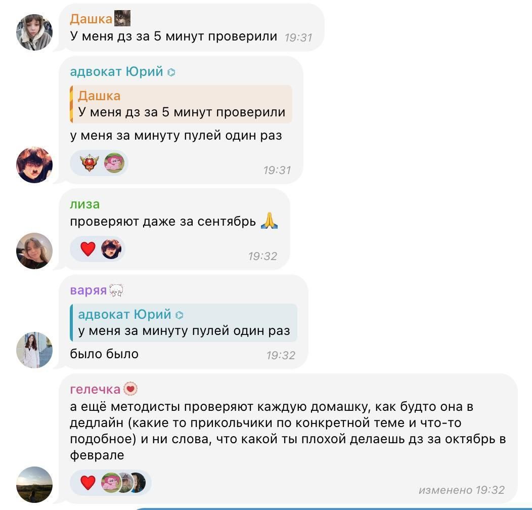 Часто спрашивают — если не сделать домашку вовремя, то её проверят после дедлайна? Конечно, да! У нас в neofamily дзшки проверяют методисты (все обязательно сдали на 90+, а бОльшая часть — на 95+), они же отвечают на вопросы в чате прямо на платформе (с голосовыми сообщениями 🥺) Самое крутое в этом — это биржевая система работы! Благодаря ей методисты всегда отвечают в чате за 5 минут, а домашки проверяют всего за 20-30 минут 🔥 В биржевой системе все домашки получают одинаковый приоритет — неважно, когда ты их сдаёшь. Плюс, не нужно ждать, пока куратор будет онлайн и просить его проверить условное дз за прошлую неделю, все происходит автоматически 🤓 В итоге вы получаете офигенную супер-быструю проверку от прошаренных методистов (которые не тратят время на поддержку и тд, как во многих ош — этим у нас занимаются отдельные кураторы) А дедлайны созданы в первую очередь, чтобы вы не копили долгов на курсе, котятки 🫶 С методистами вы уже можете пообщаться на Летней школе! Сразу по