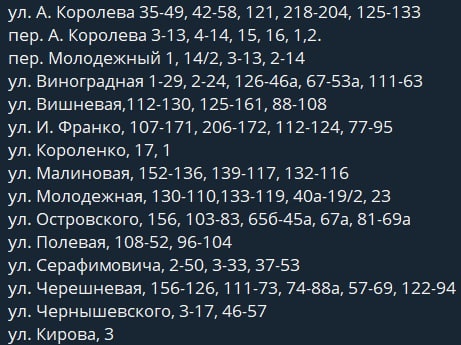 Отмечается, что электричество отключат на 13 улицах и в двух переулках областного центра. Более того, «Запорожьеэнерго» (филиал АО «Юго-Западная Электросетевая Компания») заявляет, что ремонтные работы также планируются завтра в сёлах Привольное и Степановка. В связи с этим будет отсутствовать электроэнергия с 9:00 до 17:00.