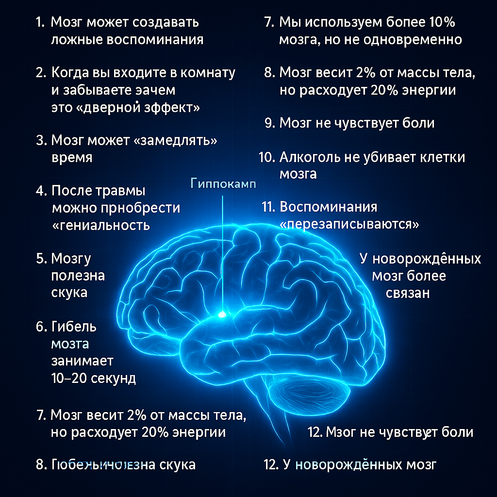 ❗ Ты уверен, что управляешь своими мыслями? Прочитай до конца — и ты усомнишься в собственных воспоминаниях, решениях и даже… вкусе к жизни. 1. Мозг может сам создавать воспоминания — и ты не отличишь ложь от правды Учёные из Университета Калифорнии доказали, что мозг может “дописывать” прошлое. В одном эксперименте испытуемым показывали фейковые фотографии их детства. Через 2 недели 48% были уверены, что эти события реально происходили. Ты тоже так можешь. Прямо сейчас. 2. Когда ты входишь в комнату и забываешь зачем — это не лень. Это “дверной эффект” Твой мозг “перезагружает контекст”, когда ты пересекаешь дверной проём. Это древний механизм: новая территория — новые задачи. 3. В момент стресса мозг может замедлить время Ты прыгал с тарзанки или попадал в ДТП — и всё как в замедленной съёмке? Это не фантазия. Мозг активирует участки, ответственные за мгновенную запись в память. Ты не замедляешь время — ты просто фиксируешь больше кадров. 4. Мы используем больше 1