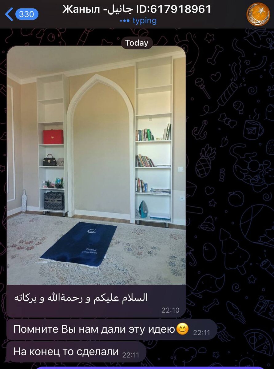 Аж до мурашек. Я в свое время делился разными дизайнами молельных комнат в доме, и вот семья себе сделала. Милость Аллаха безгранична. 🤲 Так радостно стало. ☺️ Машаа Аллах.