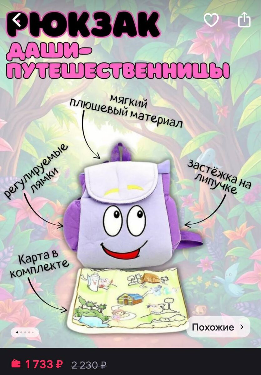 Рюкзак ДАШИ ПУТЕШЕСТВЕННИЦЫ завезли на маркетплейсы! Аксессуар полностью повторяет оригинал, а в подарок к нему идёт та самая карта. Пишут, что рюкзак достаточно вместительный для учебников, игрушек или личных вещей — идеально подойдет детям и подросткам. 25-летние дети, выросшие на Даше: *громко пропели песню рюкзака*