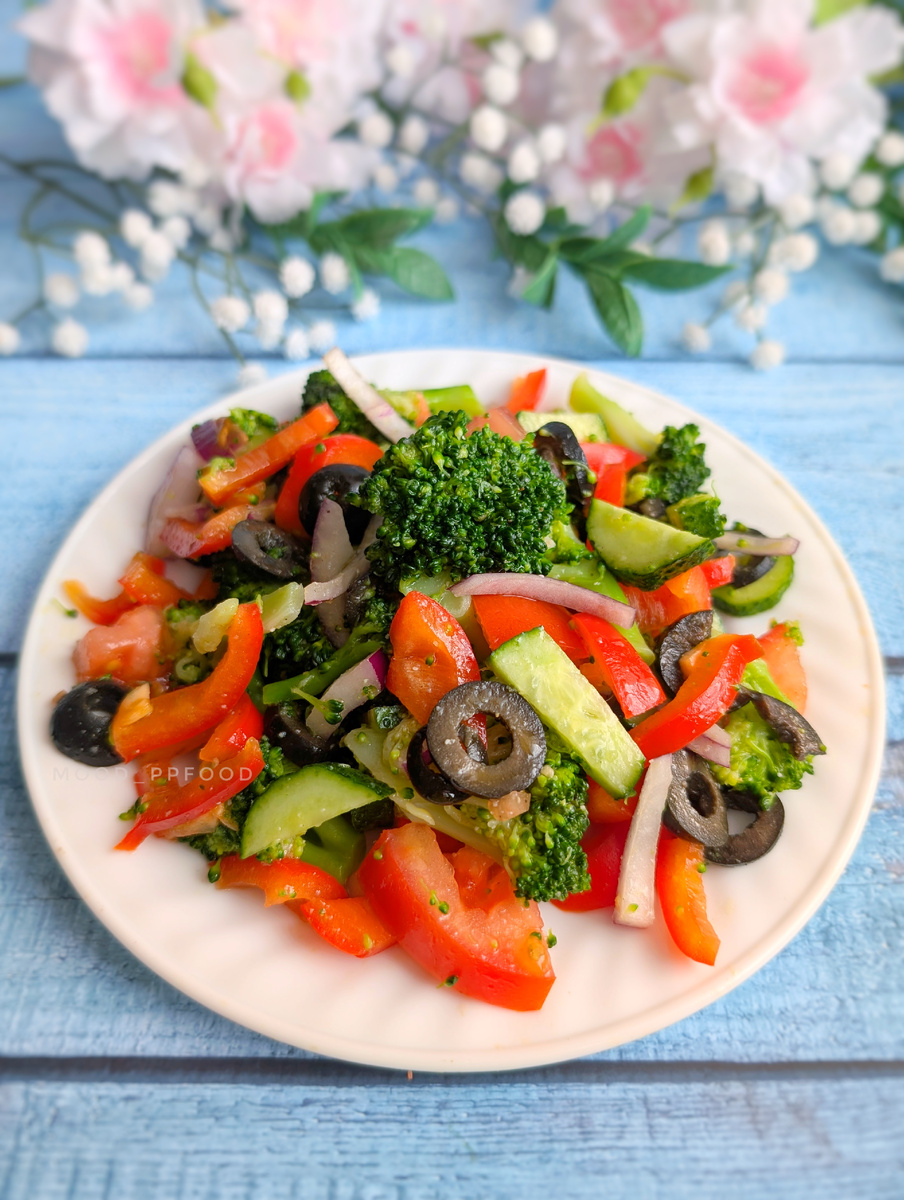 Брокколи - 150 г. Помидор - 100 г. Огурец - 80 г. Перец сладкий - 50 г. Лук фиолетовый - 40 г. Маслины б/к - 50 г. Масло раст. нераф. - 30 г. Сок лимонный - 15 г. Чеснок - 1-2 зубчика. Соль, перец. 1️⃣ Брокколи опускаем в кипящую воду и отвариваем 3 минуты. Затем откидываем на сито и обдаём холодной водой. 2️⃣ Сладкий перец, помидор, огурец нарезаем произвольно и объединяем в миске с брокколи. 3️⃣ С маслин сливаем сок, измельчаем и добавляем к остальным ингредиентам. 4️⃣ В отдельной ёмкости делаем заправку: смешиваем 30 г. растительного масла, 15 г. лимонного сока и два зубчика чеснока. 5️⃣ Поливаем нашей заправкой салат, солим, перчим по вкусу и перемешиваем. Готово, приятного аппетита 😋