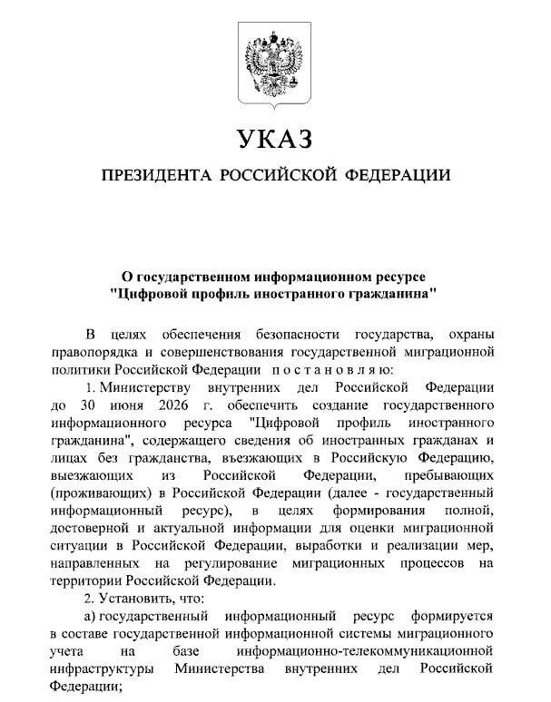 Президент Владимир Путин своим указом поручил МВД РФ создать государственный информационный ресурс «Цифровой профиль иностранного гражданина» Он должен быть сформирован до 30 июня 2026 года в составе государственной информационной системы миграционного учета Оператором ресурса (как и для «материнской» системы) определено МВД Въезжающим в РФ без виз иностранцам надо зарегистрироваться в приложении ruID как минимум за 72 часа до пересечения границы, снять свою фотографию и записать образец голоса, а уже в России — подтвердить данные в МФЦ Прохождение этих процедур дает приезжему возможность оформить патент на работу и купить сим-карту мобильных операторов в РФ @imaxai Подписаться