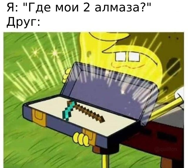 Поднимите себе настроение при помощи мемов в Майнкрафте. Сегодня я представлю для вас новую подборку мемов в Майнкрафт. С предыдущей подборкой можно ознакомиться здесь. То чувство, когда ты пошел добывать алмазы для того, чтобы скрафтить себе алмазный меч, но живешь со своим другом, который потратил их на алмазную мотыгу))). Когда отправился купаться на озеро и случайно нашел такое место, где есть квадратные волны. Ты явно подумал о Майнкрафте. Наверное, нужно вылезти из воды! То чувство, когда жарко и ты купил себе мороженное в Магазине, а тебя флешбекнуло к Майнкрафту и ты, теперь, явно видишь книгу, которую отредактировали))). Именно с таким чувством сталкивался каждый из нас, когда покинул болото в Майнкрафте. Когда лежишь в кровати со своей девушкой, а она думает, что ты задумался о других, но на самом деле ты думаешь о том как бы заработать на жизнь. Если понравилось, поставь лайк, оставь комментарий под постом, и подпишись! Я буду очень рад твоему присутствию! А другое, мож