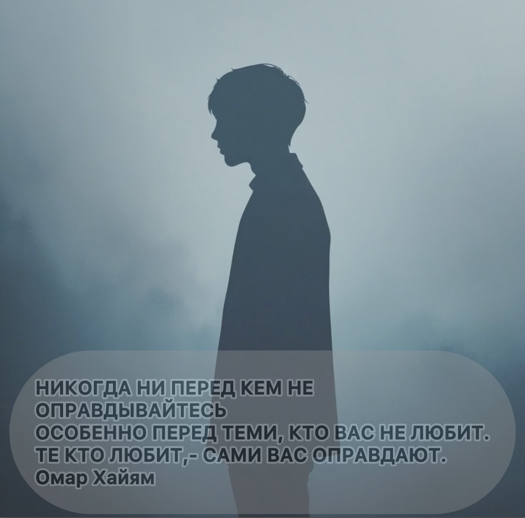 Это мощный и лаконичный психологический посыл, который действительно может стать опорой для многих. Разберём его глубже: — Страх быть непонятым или отвергнутым. — Желание доказать свою «хорошесть» даже тем, кто не способен это оценить. — Внутренняя неуверенность: «Если я не объяснюсь, меня посчитают виноватым». — Оправдания перед недоброжелателями дают им инструмент для манипуляции. — Это истощает энергию и подрывает самоуважение. — Любящие люди не требуют оправданий — им важны ваши мотивы, а не отчёт. 3. Как реализовать этот принцип? — Замените оправдания ясными констатациями: «Я так решил(а)». — Практикуйте молчаливую уверенность: ваши действия не нуждаются в одобрении всех. — Различайте конструктивную критику и токсичные придирки — на второе просто не реагируйте. Это правило — не про упрямство, а про экономию душевных ресурсов. Ваша ценность не зависит от чьего-то одобрения. Как говорила Маргарет Митчелл: «Никто не может заставить вас чувствовать себя униженным без ваш