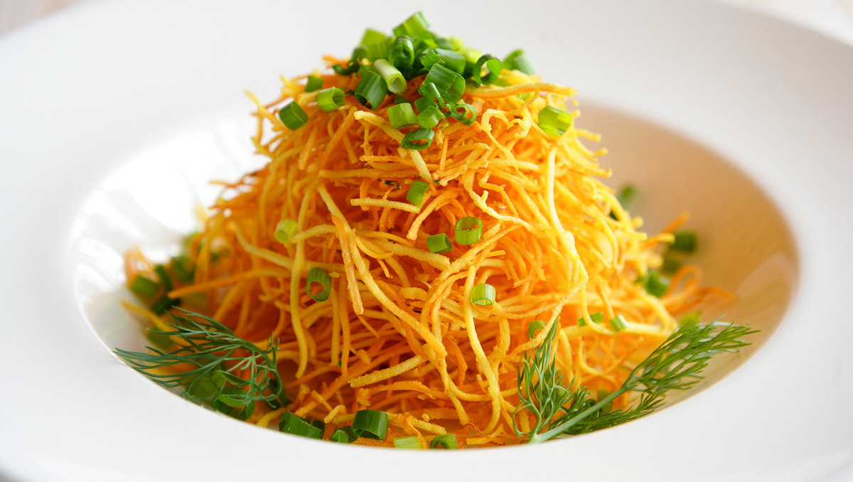 🟩Картофель натереть на тёрке для корейской моркови, промыть, обсушить и обжарить до хруста в большом количестве масла.