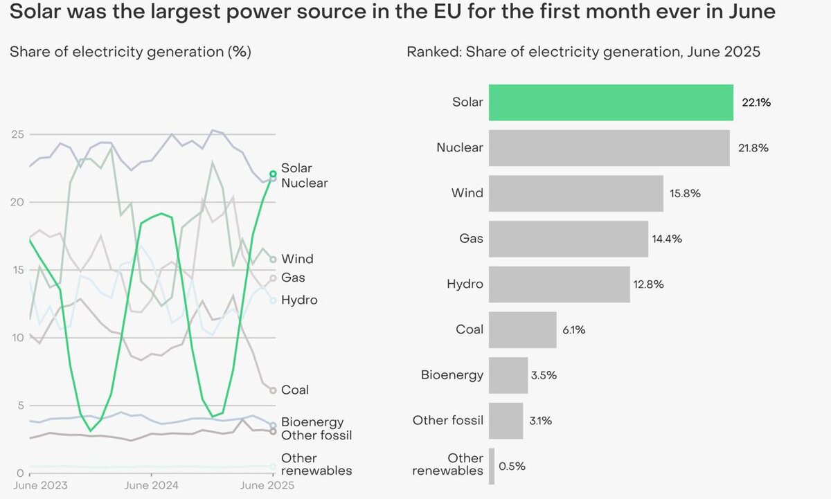 В июне солнечная энергия впервые стала крупнейшим источником электроэнергии в ЕС- 22,1% в энергобалансе ЕС