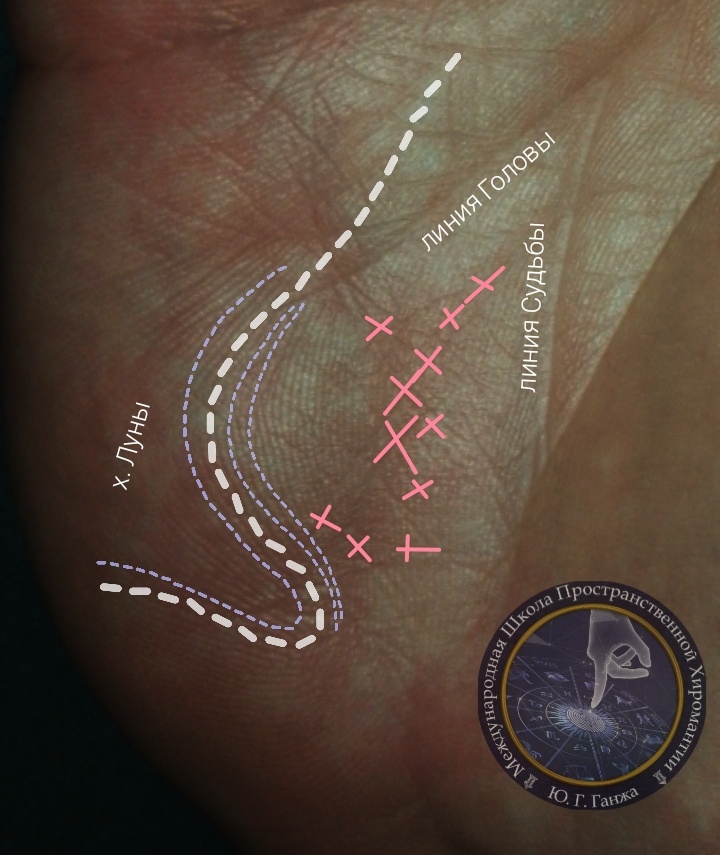 🚩Скопление крестов на х. Луны. Практический пример🚩 🖍На данном практическом примере действия происходят на х. Луны. 🖍Который непосредственно связан с нашим подсознанием, психикой, переживаниями, нервными расстройствами. Что является одним из многочисленных свойств х. Луны, но важным именно для этого случая. ✅Папиллярный свод отобразил в датировке по Меркурию период напряженного момента в жизни человека, когда ему необходимо было задействовать максимум сил для преодоления препятствий. ✅Свод усложнен дополнительным изогнутым в противоположную сторону дуговым узором. ✅Само по себе уже это сочетание на х. Луны дает не стабильную психику, склонности к перепадам настроения, к депрессиям в том числе. ✅Скопление малых крестов, как россыпью также дополняют периоды и указывают на конкретные временные точки переживаний, расстройств, нестабильности психики. Их центры и я валяются точными годами по времени. ✅Кресты составные, не отдельностоящие. И если приглядеться их основу сост