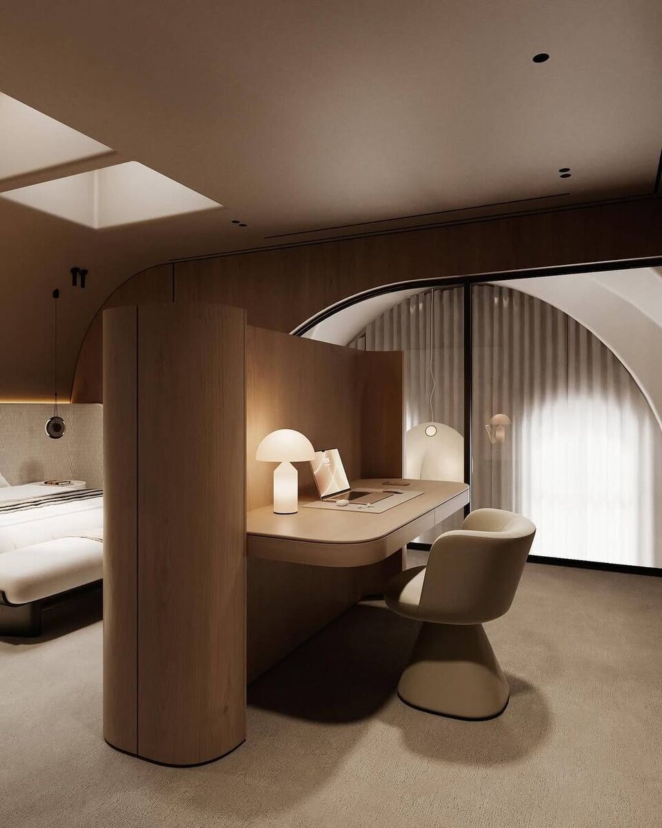 Самая необычная спальня в нашем портфолио! Радиусное окно выходит в зону второго света в гостиной, прямо на окна высотой в два этажа. Пространство уютное и камерное, приятное тактильно: на полу ковролин, на стенах шпон, мягкие ткани, ни одного острого угла. И только тёплые оттенки. — Project: #ARC_250 Year:2025 — +79037959696 Info@wowroom.ru #wowroomdesign —