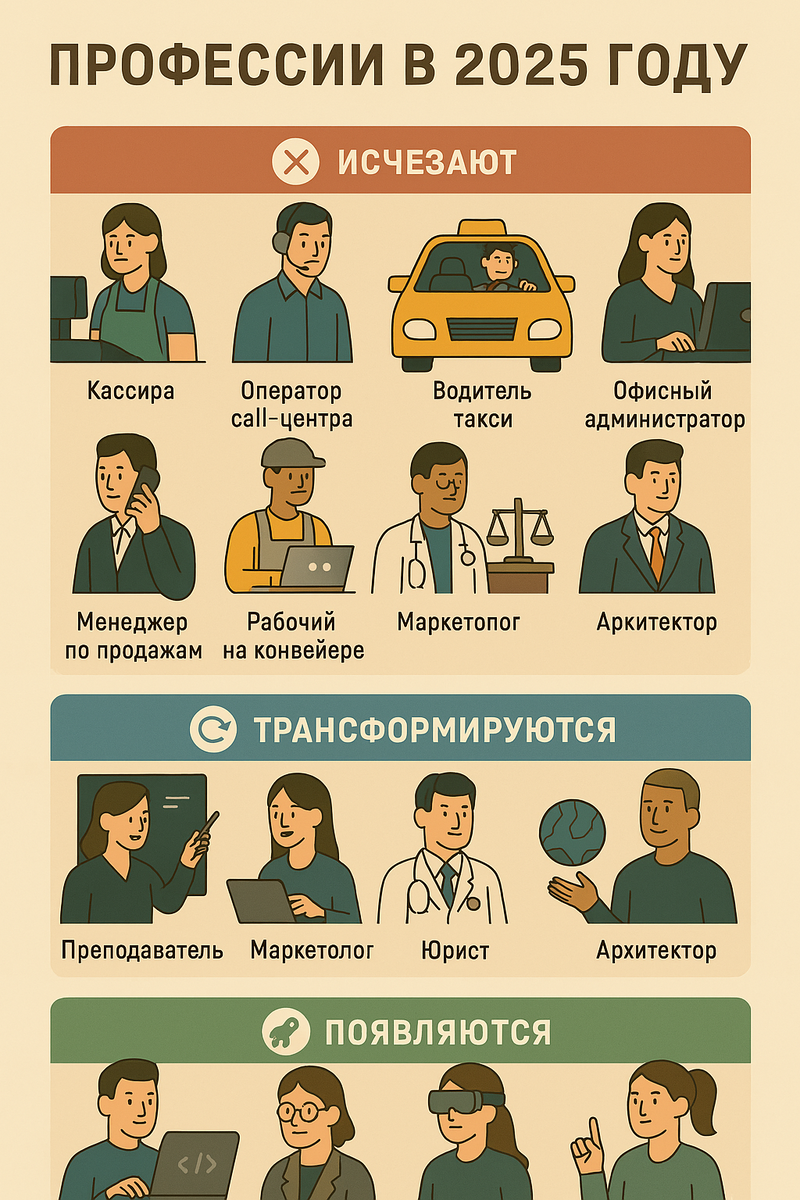 Вот как выглядит ландшафт профессий в 2025 году — одни стремительно исчезают, другие трансформируются, а третьи только появляются:
