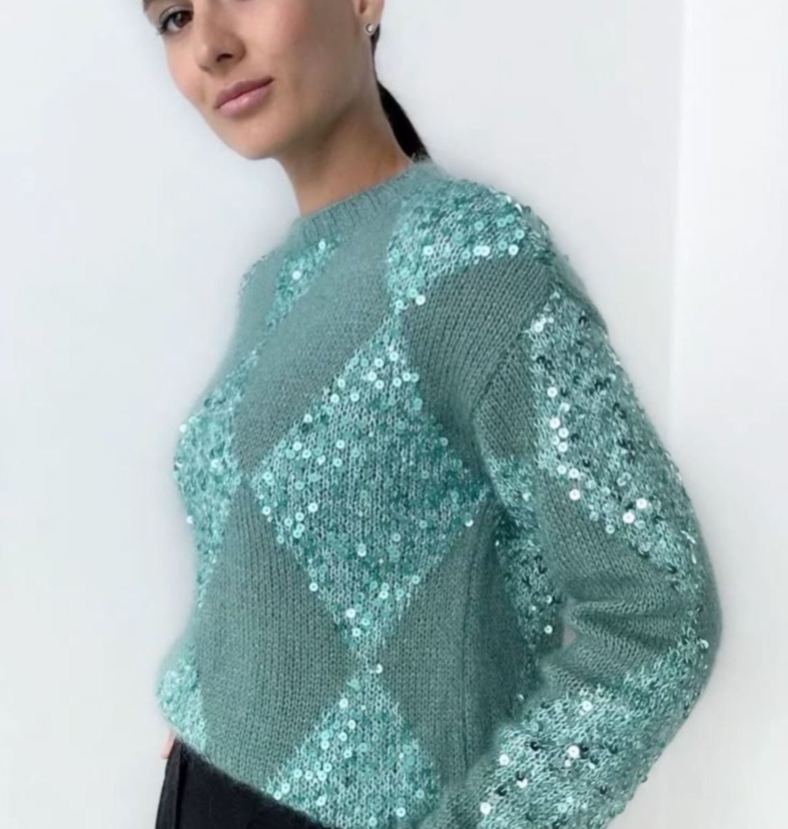Если привычные мелкие пайетки, рассыпанные редкими искорками в пряже, дают лёгкое мерцание и деликатный акцент, то королевские пайетки создают насыщенное, роскошное, почти сценическое сияние. Это материал для тех, кто не боится привлекать внимание!