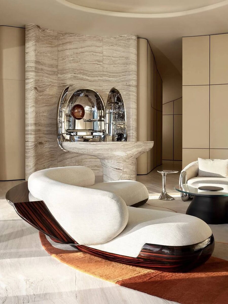 Футуристический интерьер отеля Shebara в Саудовской Аравии На побережье Красного моря открылся ультрасовременный отель Shebara Resort. Интерьер вилл отеля отражает все тренды, о которых мы писали в канале: обтекаемые округлые формы, натуральный камень, который используют повсеместно, сочетание дорогих материалов, глянцевые поверхности, панели. Снаружи отель также красив и футуристичен. Виллы над водой напоминают жемчужную нить, при этом каждый полированный шар из нержавеющей стали отражает море и небо. Капсулы вытянутой формы были разработаны Killa Design, а интерьеры спроектированы Studio Paolo Ferrari. Отель включает 38 вилл над водой и 35 пляжных домиков в такой же футуристичной эстетике. Энергоэффективный курорт работает на солнечных батареях. Виллы с одной спальней имеют площадь 103 кв. метра, с двумя спальнями — 189 кв. метров. Космические фото вилл снаружи можно посмотреть тут. Добавили себе в план путешествий. А вы хотели бы там побывать? Пишите в комментариях. Фото: E