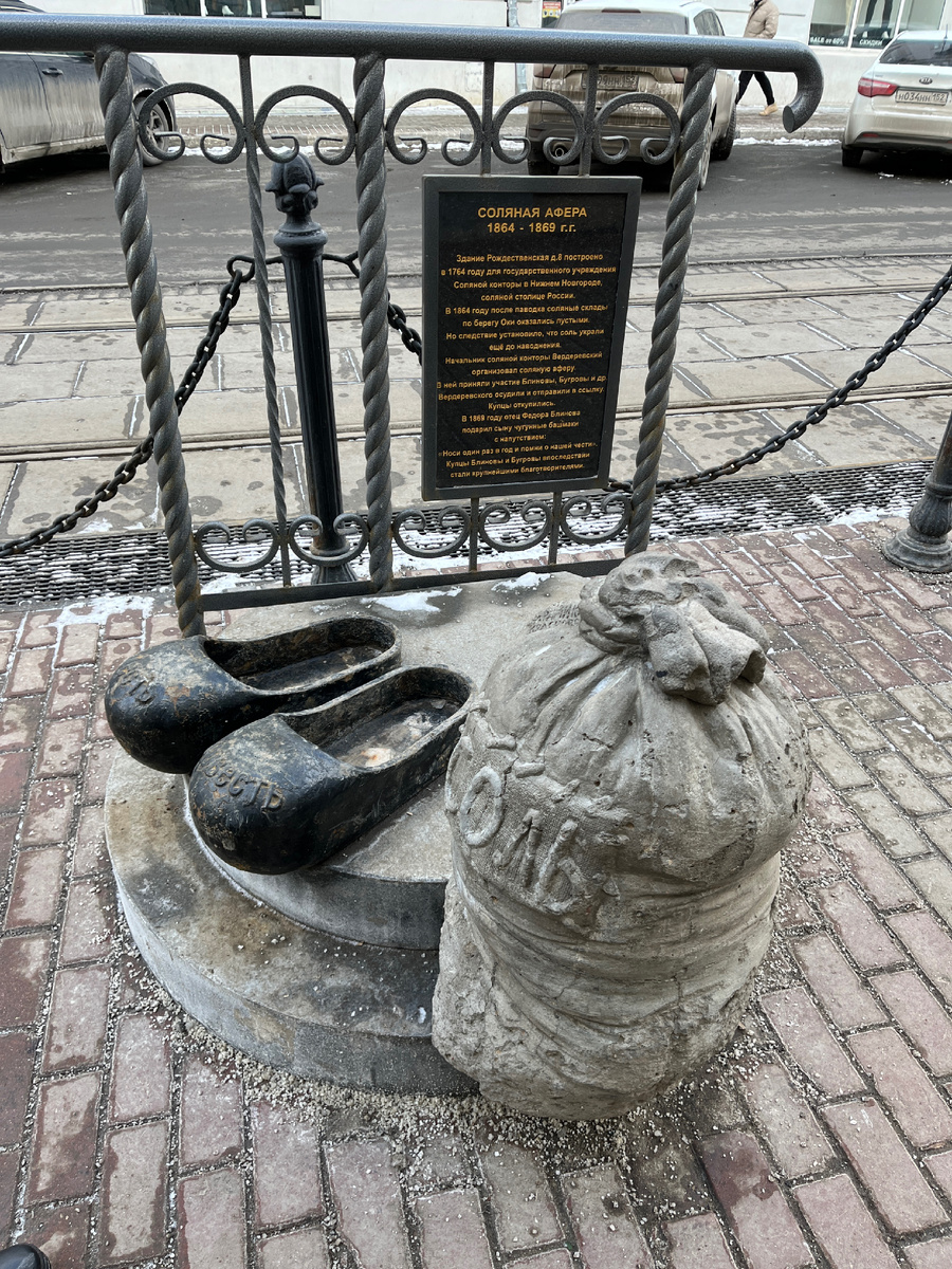 На ул. Рождественская в Нижнем Новгороде стоит небольшая композиция, напоминающая о значительном событии в жизни города. В 1764 году по адресу ул. Рождественская д. 8 было построено здание под соляную контору. С 1705 г. с введением государственной монополии на соль за Нижним Новгородом закрепился статус крупнейшей перевалочной базы и поставщика этого продукта. Именно в Нижнем находилась главная соляная контора, куда свозилась вся соль, добытая в стране на рудниках Урала, Сибири, Поволжья, Балахны. А далее она развозилась по городам страны. На соляных делах сделали капитал Строгановы в XVIII в. и Бугровы в XIX в. Самое интересное случилось в 1864 году, когда после паводка соляные склады по берегу Оки оказались пустыми. Но выяснилось, что они опустели еще до паводка, так как начальник соляной конторы дворянин Вердеревский украл и продать 1,5 тонны из государственных запасов соли, а недостачу списал на наводнение. Подельниками выступили пристав соляных запасов Терской, купцы Блино
