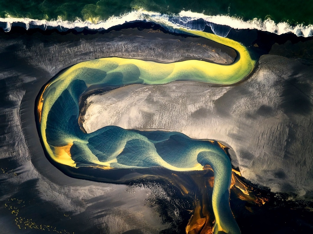Исландия — настоящая сокровищница контрастов и природной красоты на каждом шагу. На фото изображена не река, а природное явление. Это ледниковый сток, который при определенных условиях, например, при смешивании с минеральными отложениями, может приобретать яркий (особенно на фоне темной поверхности) желтый оттенок. Желтые краски воды в "реке" обусловлены высокой концентрацией серы и железа, характерной для вулканической активности. На карте данную "реку" не найдете. Это не постоянная река. Она лишь изредка появляется на южном побережье Исландии, когда ледниковый сток приносит богатые минералами отложения. Где и когда можно увидеть данное природное явление? Никто не знает. Сами исландцы описывают это как мимолетное явление — меняющее местоположение или исчезающее на годы. Так что, не всем посчастливится стать свидетелем красивых естественных красок. Наибольшие шансы увидеть "исландскую Хуанхэ" в конце весны или начале лета в юго-восточной части страны, когда сток воды наиболее велик.