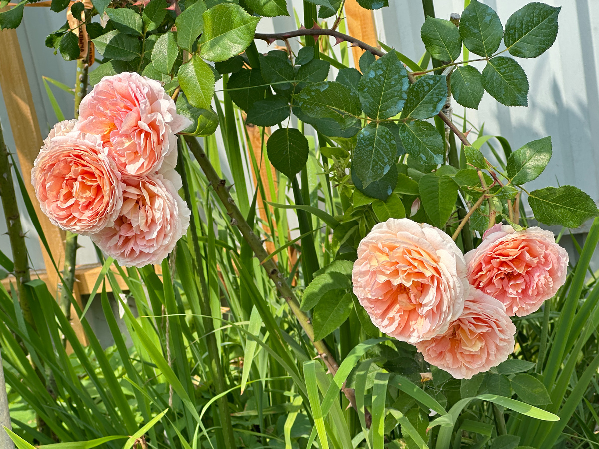 Безымянная (пока!) привитая роза поразила обилием крупных цветков, которых оказалось одновременно так много, что одна из ветвей не вынесла – и надломилась, несмотря на предусмотрительно поставленную опору.