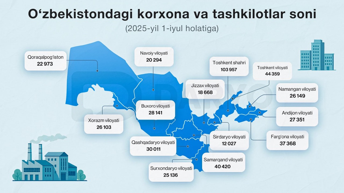 2025-yil 1-iyul holatiga ko‘ra, respublikada faoliyat ko‘rsatayotgan korxona va tashkilotlar soni 463 mingtani tashkil etdi