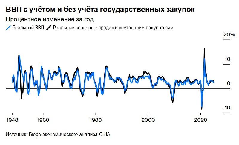 Что останется от роста ВВП США без "печатного станка" под госрасходы? Отрицательный рост, как любят сейчас говорить, хех. Споры о методологии расчёта ВВП вновь обострились. Нобелевский лауреат Саймон Кузнец ещё в 1930-х годах выступал против включения госрасходов в расчёт ВВП. Эту позицию недавно поддержали Илон Маск и министр торговли США Говард Латник, предложив разделить в расчётах государственный и частный сектор. Объясним "на пальцах" ВВП (валовой внутренний продукт) — это общая стоимость всех товаров и услуг, произведенных в стране за год: ВВП = Потребление (C) + Инвестиции (I) + Госрасходы (G) + Чистый экспорт (NX). Госрасходы (G) включают зарплаты госслужащих, закупки товаров и услуг (например, военная техника, инфраструктура), социальные выплаты (пенсии, пособия). Кузнец, Маск и Латник предлагают убрать (G) из формулы ВВП, оставив только частный сектор (C + I + NX). Кузнец аргументирует это ростом ВВП за счёт, например, миллиардных трат государства на ненужную инфрастр