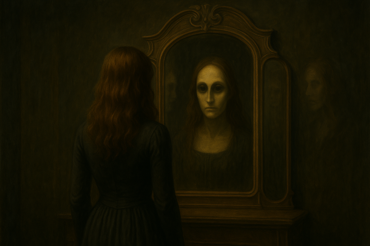 Она решила проверить записи прабабушки в подвале. Спустившись по скрипучим ступеням, она обнаружила, что зеркала здесь ведут себя особенно странно. В одном из них отражение было совсем не похоже на нее — там стояла женщина в старомодном платье с пронзительными глазами.
