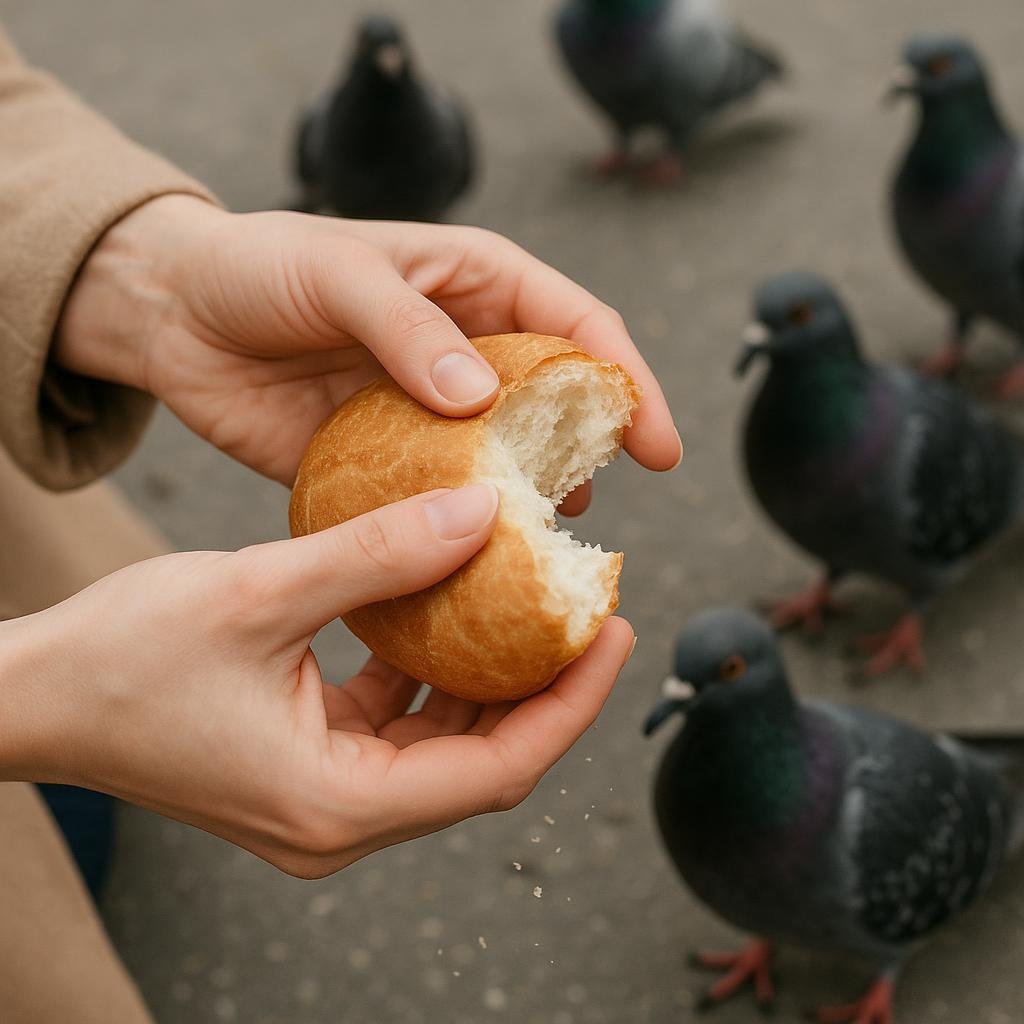 Мы уселись на старую скамейку у фонтана, которой раньше даже не замечали. А сегодня — мы втроём, тесно, просто так. Я разбрасываю хлеб голубям, Таня обнимает меня за плечи.